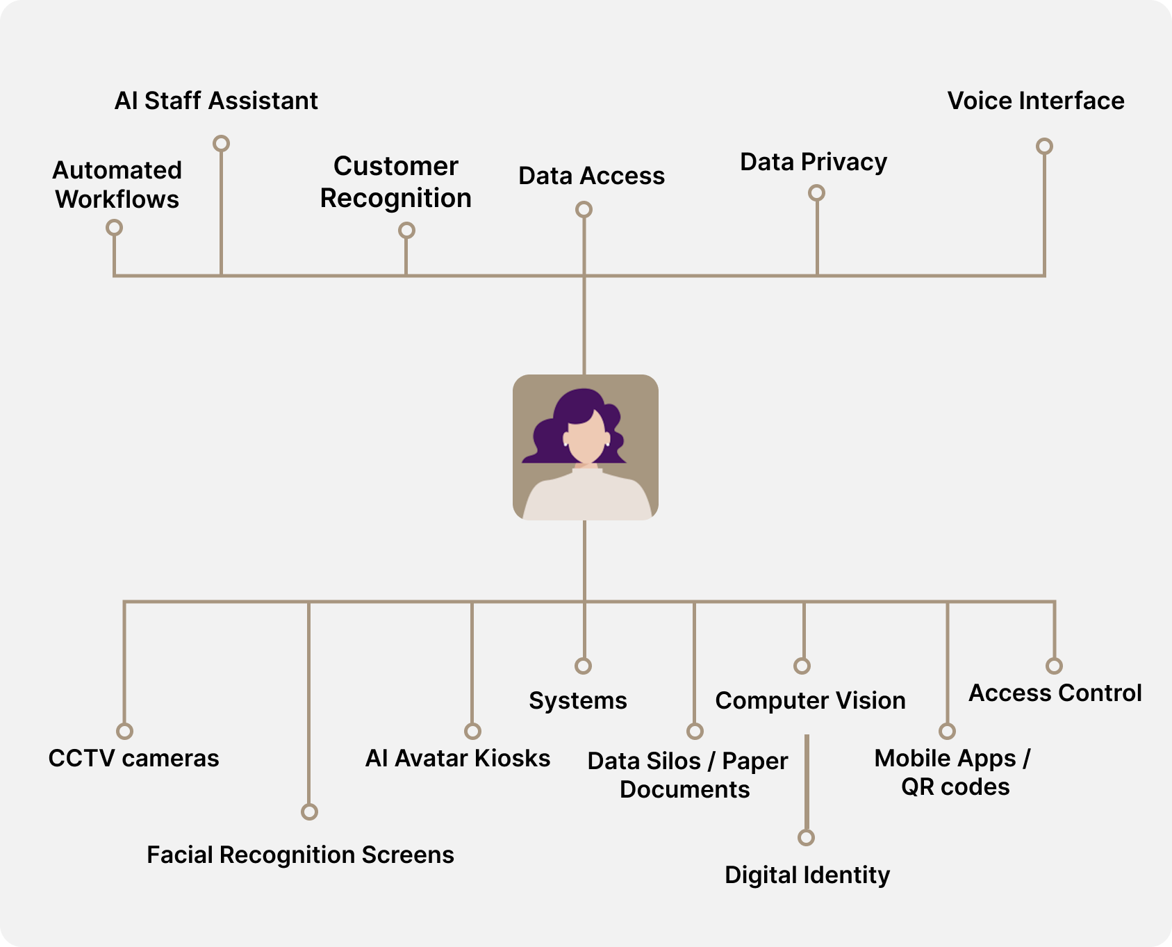 يتم التعرف على العملاء إما من خلال شاشات التعرف على الوجوه في شبابيك الصرافين أو كاميرات الدوائر التلفزيونية المغلقة في مداخل الفروع. يمكن لوحدات الذكاء الاصطناعي أن تعزز قدرات حوسبة الكاميرات لقواعد بيانات الوجه الكبيرة. يمكن معالجة البيانات محلياً أو على السحابة وإتاحتها على الفور عبر الفروع.